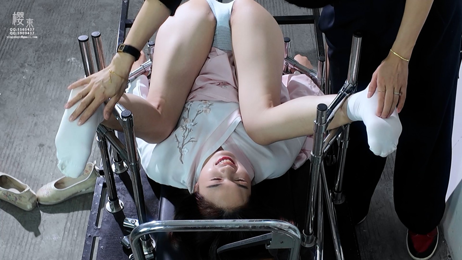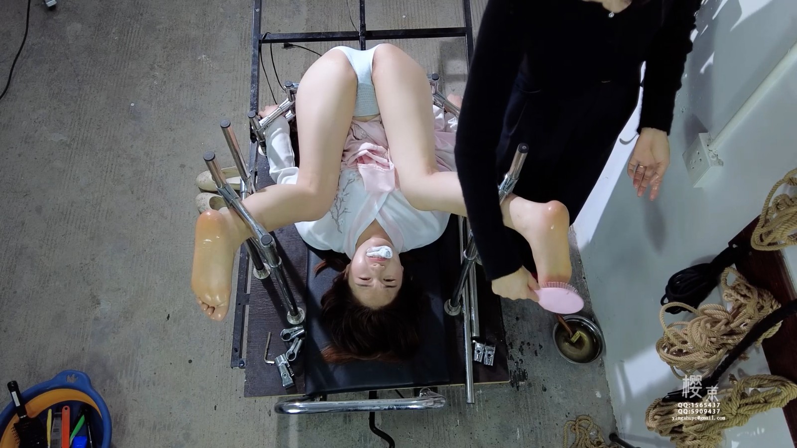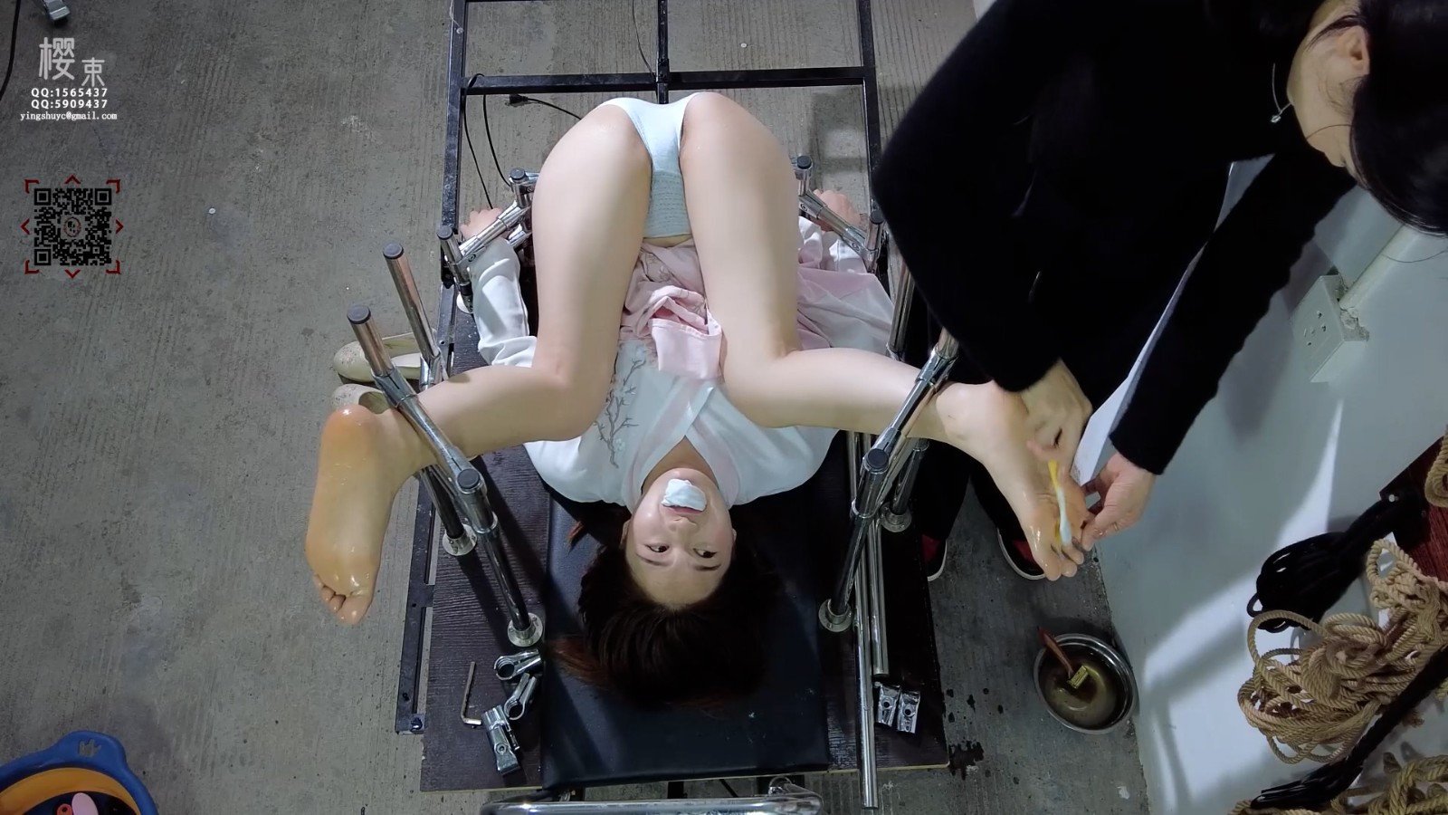 定拍转公映!今天由第十号试验者进行新研制的痒痒油试验并记录!先将她固定在刑架上隔着白袜测试怕痒程度再脱下袜子刷上痒痒油用各种工具测试药效!并架上炮机强力输出看敏感程度是否有提升!